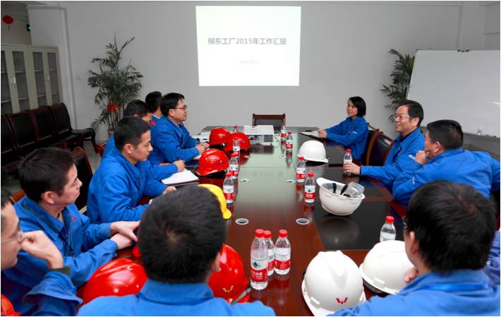 ? ??隨后,韋董一行來到公司柳東工廠進(jìn)行調(diào)研,在參觀生產(chǎn)現(xiàn)場(chǎng)后與柳東管理團(tuán)隊(duì)進(jìn)行座談。柳東工廠廠長(zhǎng)黃輯匯報(bào)了2015年柳東工廠運(yùn)行情況及2016年業(yè)務(wù)突破。